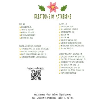 Kreations by Katherine products follow most of the seasons, offering products made from what ingredients are in season at their peak freshness. This summer, visit Kat at the Jeffersonville Farmer's Market on Old Main Street Wednesday nights, and the Jericho Farmer's Market Mills Riverside Park on Thursdays.